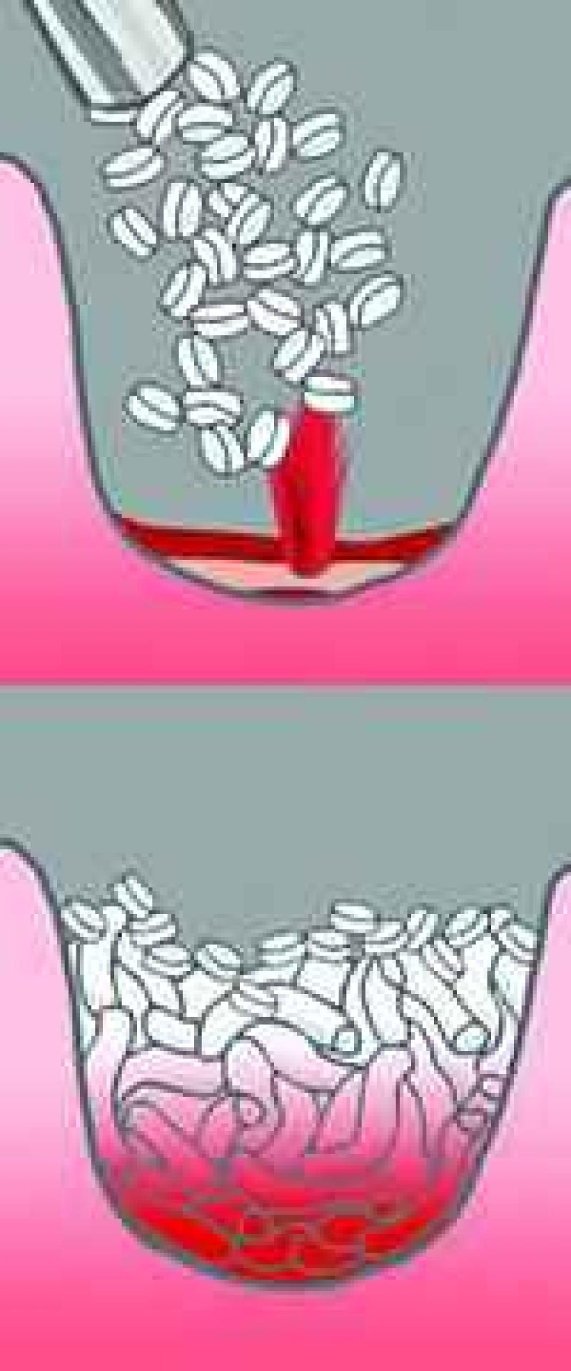 Daarop probeerde het team het met sponsjes, die ze in ronde stukjes van een centimeter sneden. De sponsjes bleken ideaal te zijn om het bloed te stelpen. Het materiaal waaruit de sponsjes gemaakt moesten worden, was het laatste probleem. Je kan moeilijk een keukenspons in stukken snijden en in het lichaam injecteren. Daarom creëerde het team een spons gemaakt van houtpulp die ze onderdompelende in chitosan. Dat is een bloedstollende, antimicrobiële stof die afkomstig is van garnalen. Er werden kruisjes gezet op de sponsjes die zichtbaar zijn op een röntgenfoto zodat er geen sponsjes in het lichaam achter kunnen blijven.