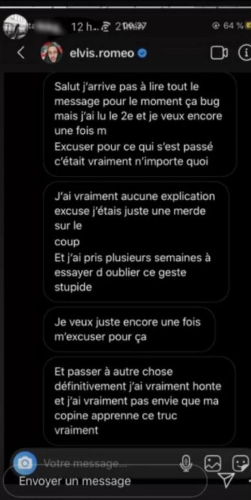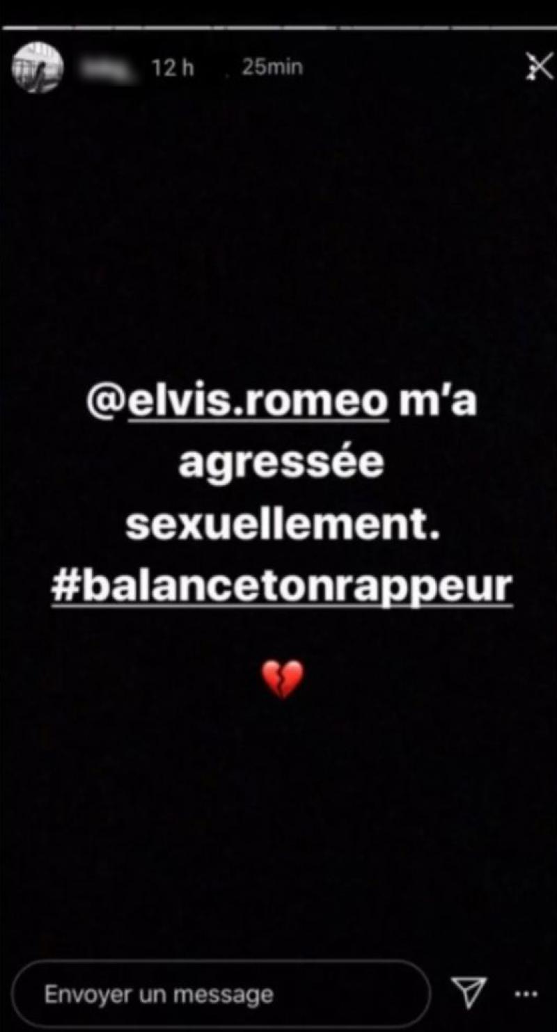 Een jonge vrouw postte dinsdagmiddag een verhaal op Instagram waarin ze zei: Roméo Elvis heeft me aangerand, gevolgd door de hasthag #balancetonrappeur, een verwijzing naar het bekende nummer Balance Ton Quoi' van zijn zus Angèle. Dat liedje gaat over het feit dat mannen moeten beseffen dat nee' wel degelijk nee' betekent.