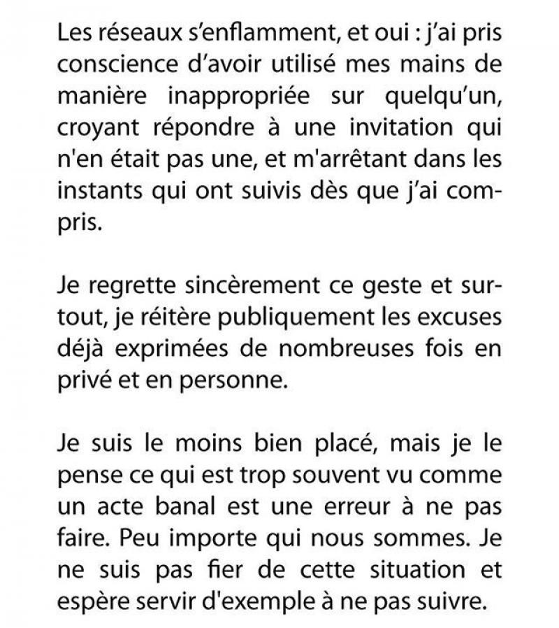 "De sociale media ontploffen en ja: ik realiseer me dat ik mijn handen op een ongepaste manier op iemand heb gebruikt", schrijft de Brusselse rapper. "Ik dacht dat ik inging op een uitnodiging, die er evenwel geen bleek te zijn. Toen ik dat enkele ogenblikken later doorhad, ben ik meteen gestopt."