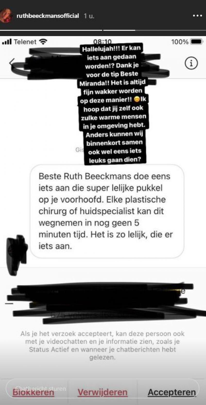 De 38-jarige Wat als?'-actrice deelde het onbeschofte privébericht op Instagram. Beste Ruth Beeckmans, doe eens iets aan die super lelijke pukkel op je voorhoofd. Elke plastische chirurg of huidspecialist kan dit wegnemen in nog geen 5 minuten tijd. Het is zo lelijk, die (sic) er iets aan, klonk het.
