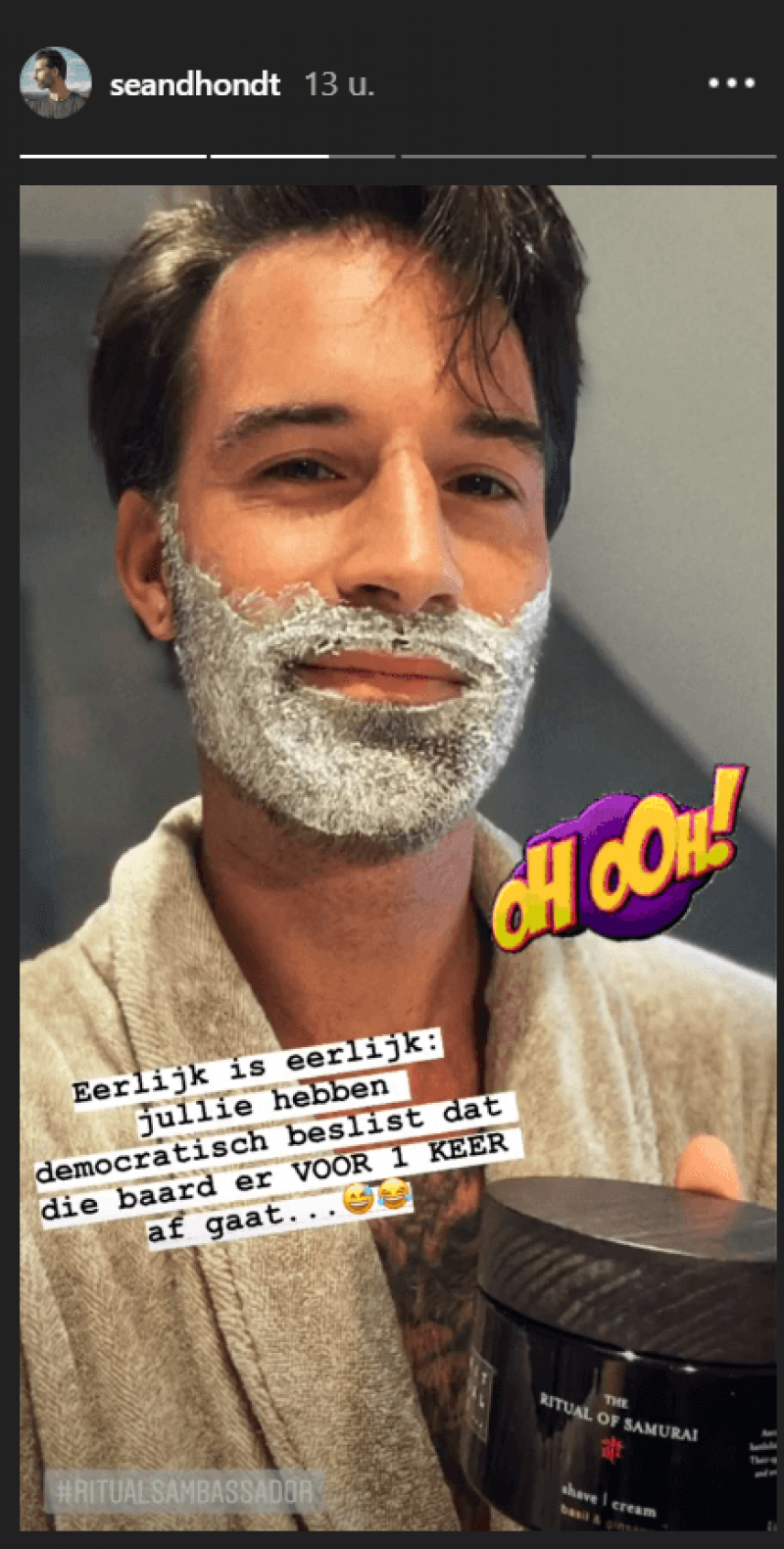 De presentator had nochtans in zijn Stories een democratische poll' gehouden waarin zijn volgers konden aangeven of hij al dan niet zijn baard moest afscheren. Belofte maakt schuld, schrijft Sean op Instagram. Jullie mochten democratisch beslissen via m'n stories en het is gebeurd: na meer dan tien jaar niet scheren, heb ik nu weer een heerlijke #babyface #ikvoeldewindweeropmijnwangen.