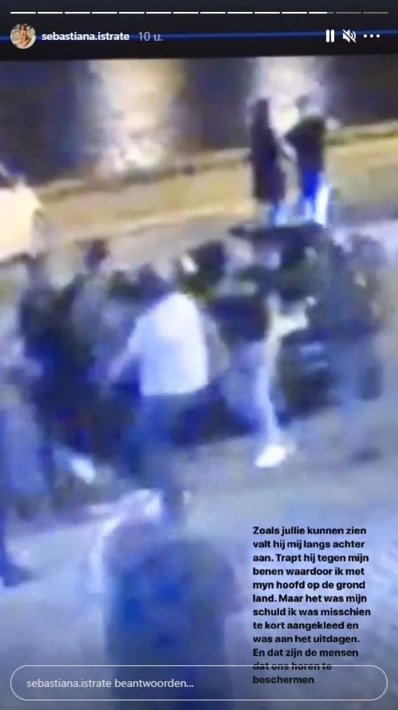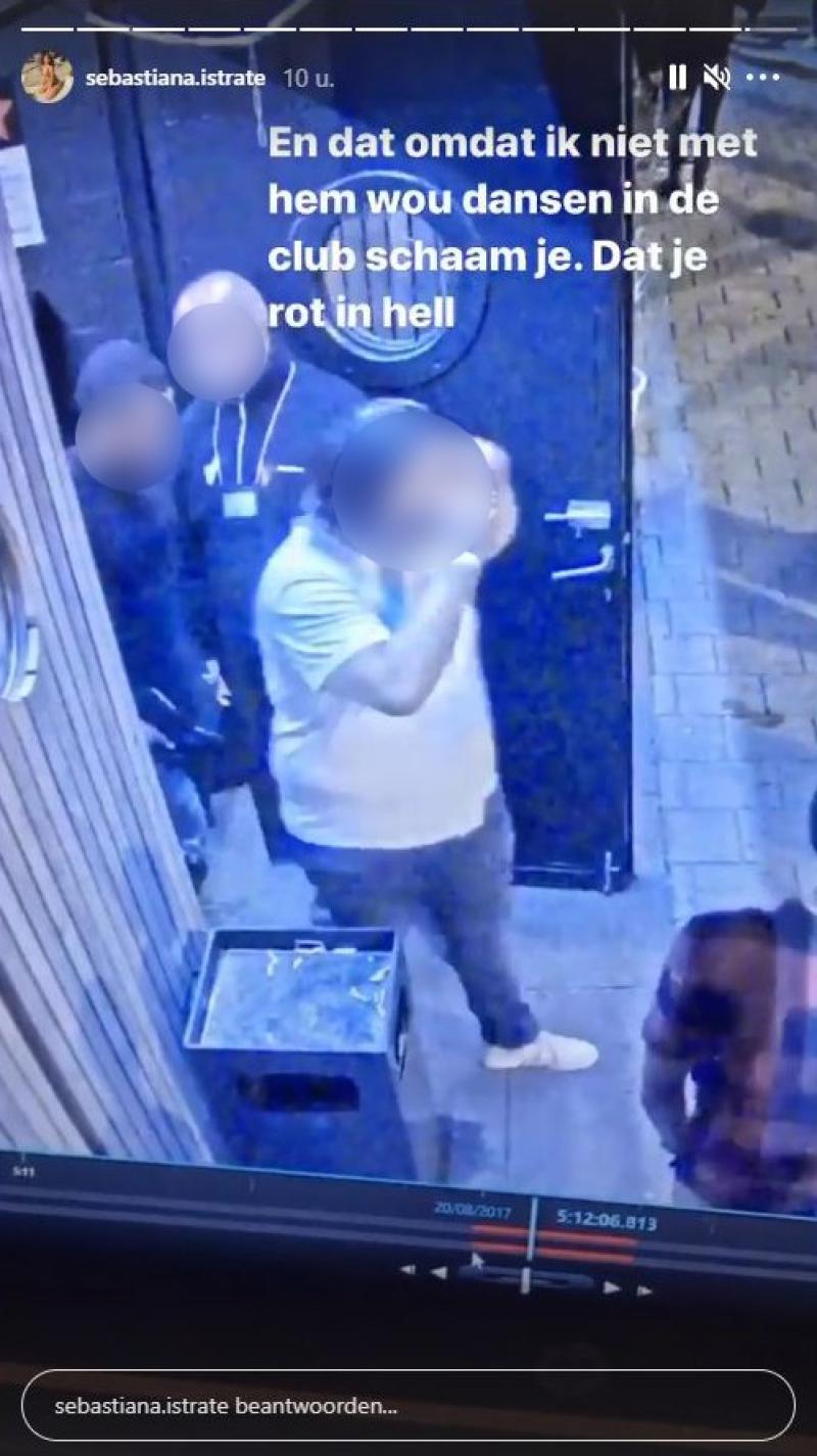 Intussen heeft Sebastiana camerabeelden van het incident kunnen bemachtigen. Daarop is inderdaad te zien dat ze door een man langs achter aangetrapt wordt en ze op de grond valt. En dat omdat ik niet met hem wou dansen in de club. Schaam je, besluit ze.