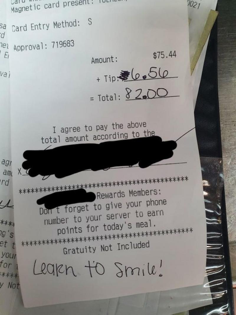 Onlangs bediende ze een klant die achteraf het volgende schreef op de rekening: Leer eens lachen. De vrouw vond de opmerking erg ongepast en kaartte het incident aan op Reddit. Heel wat mensen uit dezelfde sector reageerden verbolgen. Degoutant! Als iemand die anderhalf jaar gewerkt heeft als serveerster, heb ik met je te doen. Je zet je gezondheid en mogelijk je leven op het spel voor je werk, iets wat de meesten niet doen. Ik zie dergelijk gedrag overigens vaak bij mensen van mijn leeftijd (40). Het spijt me dat dit jou moest overkomen, schreef iemand.