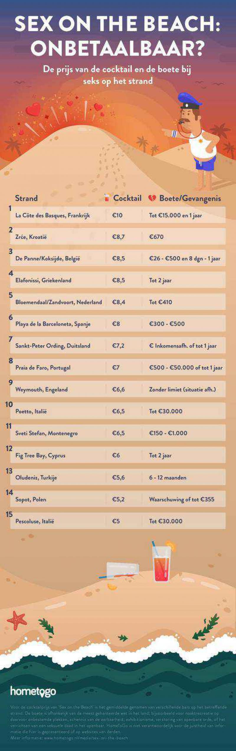 HomeToGo, een zoekmachine voor vakantiehuizen, heeft een vergelijking gemaakt van de prijzen van een 'Sex on the Beach'-cocktail op verschillende Europese stranden met de straf die je krijgt als je er in de openlucht vrijt.