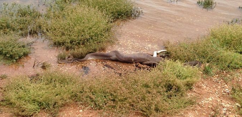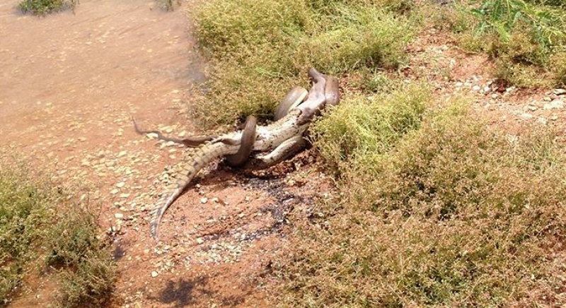 In Australië heeft een python een volledige krokodil opgegeten. Bij een meer in de buurt van Mount Isa, een stad in Noordwest-Queensland, konden toevallige voorbijgangers gisteren het episch gevecht vastleggen op camera.