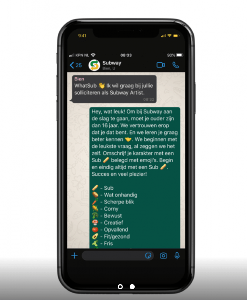 "Het schrijven van een motivatiebrief met cv wordt vaak lastig gevonden, terwijl veel jongeren wel willen werken'' zegt Reza Parvin, eigenaar van drie Nederlandse Subway-franchises in AD. Daarom wil de Amerikaanse fastfoodketen, die voornamelijk broodjes verkoopt, de sollicitatieprocedure meer aantrekkelijk en laagdrempelig maken. Dat doen ze door geïnteresseerde werknemers te laten solliciteren via WhatsApp, met emoji's. De bedoeling is dat jongeren zich als een zelfgemaakt broodje omschrijven en aan de hand van de ingrediënten hun capaciteiten tonen.