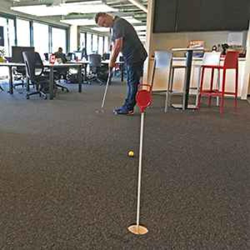 Hij vond het een leuk idee om een golfparcours te installeren op kantoor.
