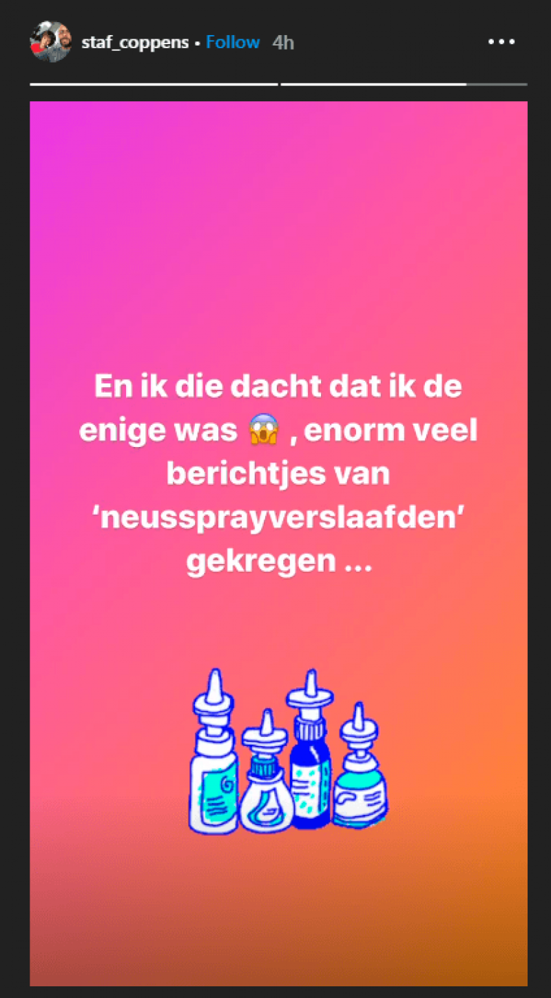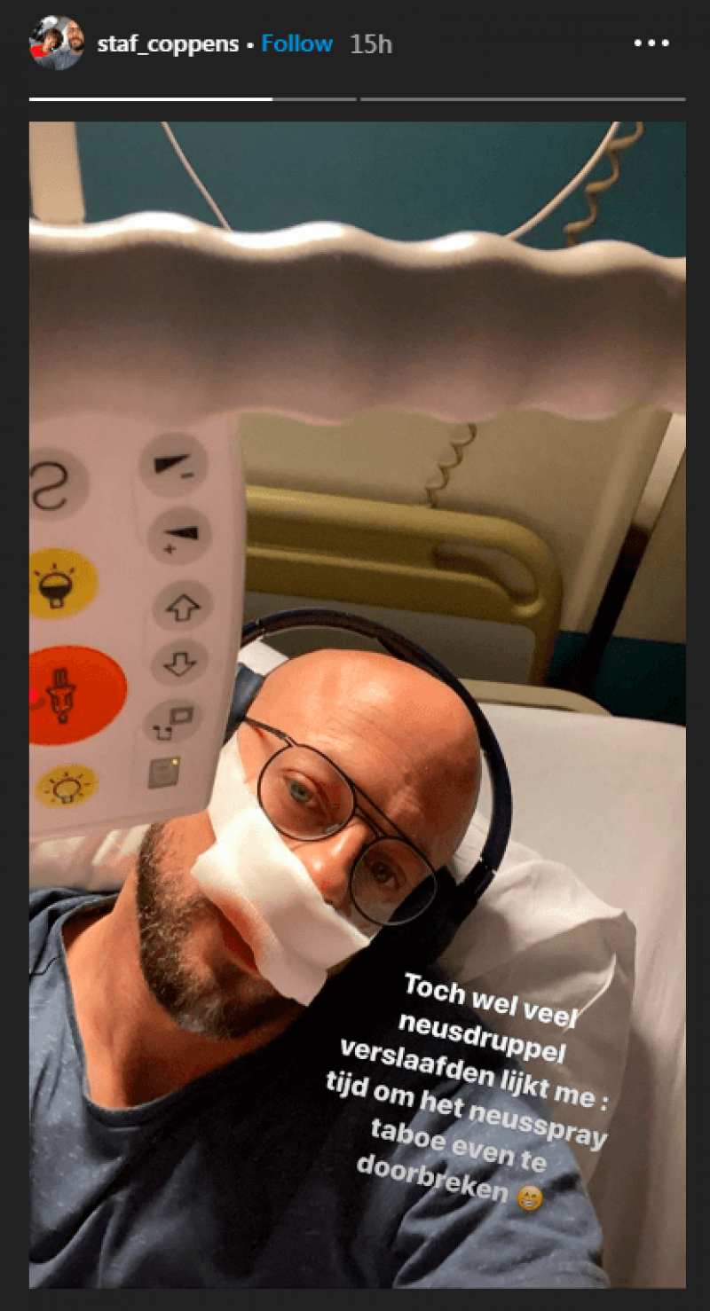 De 39-jarige Staf Coppens, gekend van onder meer het programma 'Lichaam van Coppens', hoopt bevrijdt te zijn van zijn neusspray-verslaving. Dat maakte hij bekend op zijn Instagram account. "Hopelijk verlost van die jarenlange verslaving", schrijft hij bij een foto na zijn operatie. "Na als kind mijn neus te breken brachten die verrekte neussprays telkens soelaas, maar hoe meer je ze gebruikt hoe afhankelijker je wordt", zegt hij. Het ging er zo erg aan toe dat de presentator zelfs bij de apotheek van wacht ging aankloppen of stress kreeg bij het verliezen van zo'n flesje." Nu moet hij voor goed verlost zijn van zijn drang naar de ontzwellende stof.