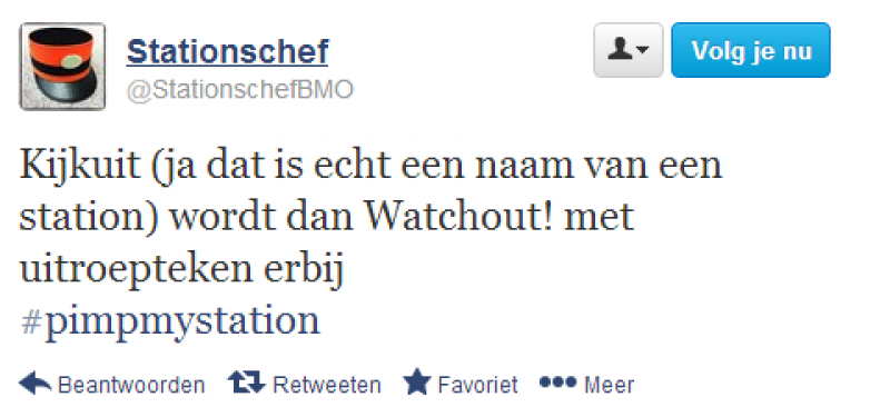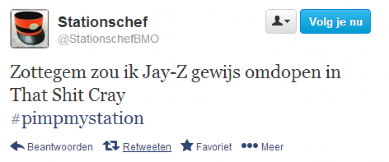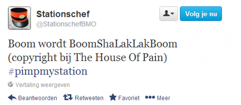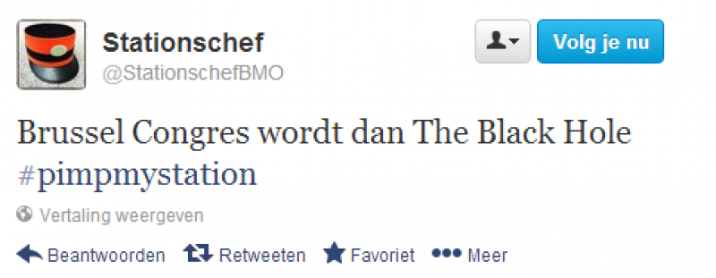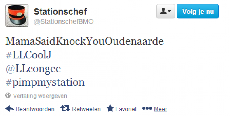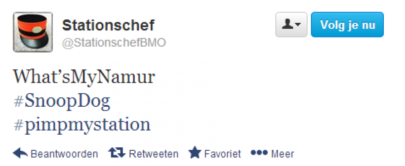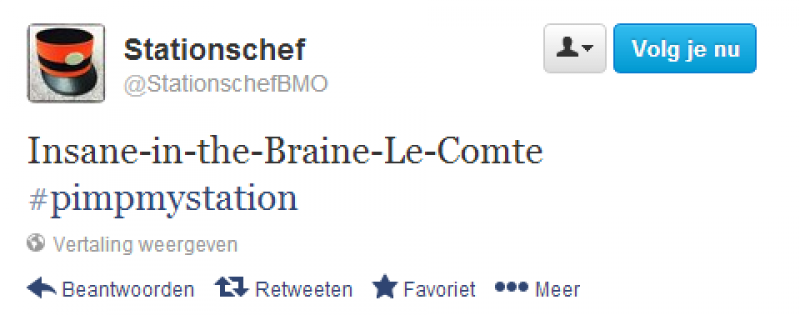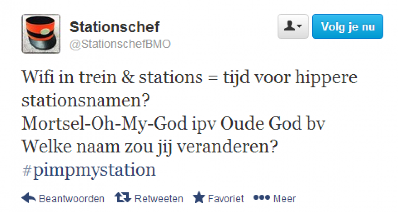 De Stationschef is een anonieme Twitteraar die positieve tweets verzint voor de NMBS. Laatst kwam hij nog op de proppen met een sinterklaasactie, waar iedereen een boodschap in letterkoekjes moest maken gevolgd door #nmbsint. Vandaag komt hij op de proppen met #pimpmystation, waar hij coolere namen bedenkt voor onze Belgische stations. Hij of zij haalt daarvoor vooral inspiratie bij bekende liedjes.