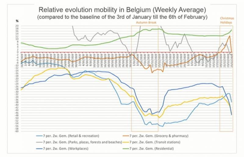 Daaruit blijkt dat we ons netjes aan de regels hebben gehouden, in die mate zelfs dat ons gedrag bijna vergelijkbaar is met de eerste lockdown. Zoals gehoopt zien we sinds de eerste week van de kerstvakantie een opvallende daling van het aantal verplaatsingen. Vele mensen zijn thuisgebleven, vergelijkbaar met het niveau van de herfstvakantie. Enkel tijdens de eerste lockdown werd er nog iets meer thuisgebleven dan met Kerstmis, zo'n 3 procent meer. Tijdens die eerste lockdown waren de niet-noodzakelijke verplaatsingen echter wel verboden, wat nu niet het geval is. Tot vlak voor Kerstmis hebben we ons weliswaar steeds vaker verplaatst voor de winkels, maar wel steeds minder voor vrije tijd en voor het werk. De daling in de mobiliteit lijkt daarmee dus opnieuw goed overeen te komen met de daling in de besmettingen, vertelde hij.