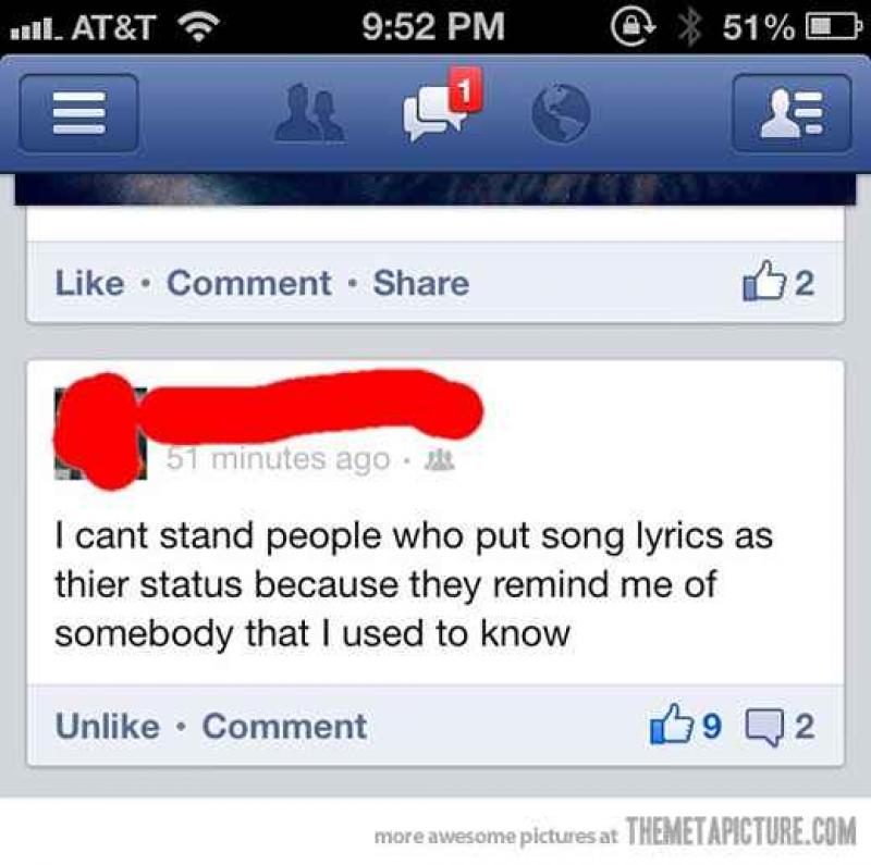 Er bestaat geen enkele goede reden om een songtekst mee te delen aan je volgers. Vind je het een leuk liedje? Post dan de Youtube-link. Heb je liefdesverdriet? Zoek dan een schouder om op uit te huilen. Maar vlucht niet naar je statusupdate. Echt niet. Niet doen dus.
