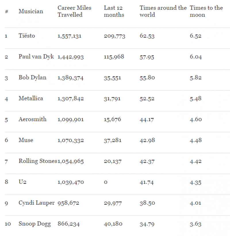 Stromae is de enige Belg in de lijst, op nummer 32 met 256.035 kilometer. Grote namen als Beyoncé en Lady Gaga reizen relatief weinig vergeleken met dj's. DJ Tiësto spant de kroon: hij legde in zijn carrière al meer dan 2,5 miljoen kilometer af. Omgerekend is dat meer dan drie keer op en af naar de maan. Op twee staat de dj Paul Van Dyk. De Amerikaanse zanger Bob Dylan sluit de top drie af.