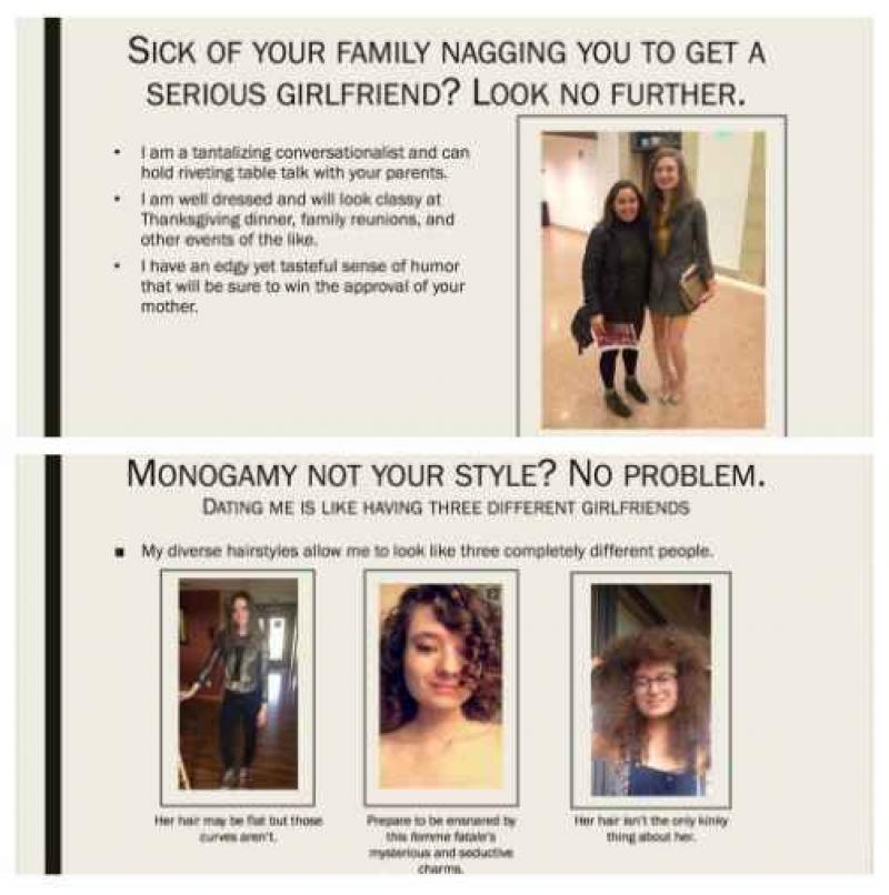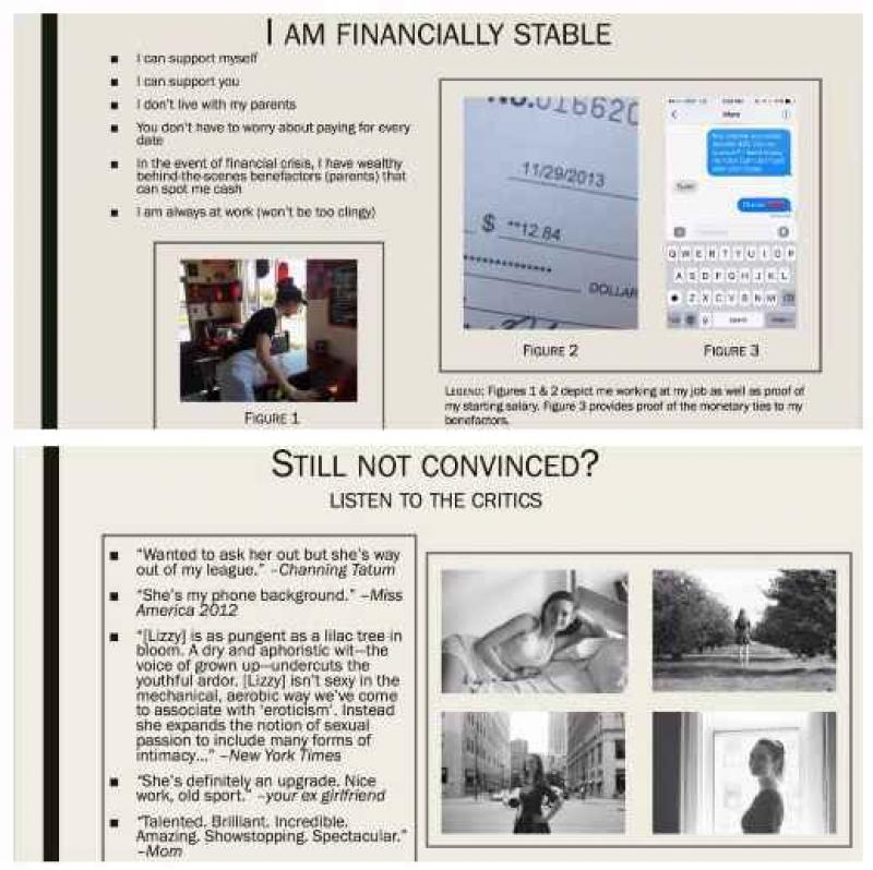 Om haar prins op het witte paard te overtuigen om samen op stap te gaan, flanste ze een powerpointpresentatie ineen. In die presentatie somde ze al haar kwaliteiten op. Zo heeft ze een goed gevoel voor humor en een knappe kledingstijl. Daarnaast prijst ze haar diverse kapsels. "Dankzij mijn verschillende haarstijlen lijk ik drie totaal verschillende personen", schrijft de student van de universiteit van Minnesota. "Zo krijg je nooit het gevoel dat je verstikt wordt in een monogame relatie."