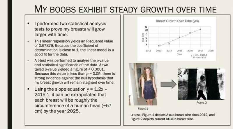 Enkele grafieken moeten de doorslag geven, en de grappigste is zonder twijfel de statistische analyse van hoe groot haar borsten nog zullen worden. Als kers op de taart lijst ze ook een paar lovende reacties van recensenten, zoals haar moeder of de bekende acteur Channing Tatum, op.