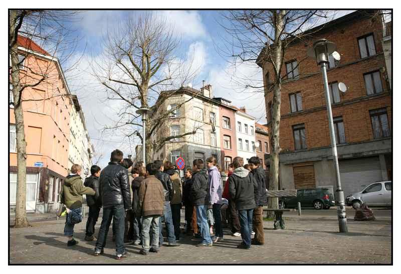 Bij het project Wonen op het dak' hoort ook een educatieve wandeling in Kuregem. Deze wijk kwam na rellen op een negatieve manier in de media. "Opnieuw leren de kinderen leeftijdsgenootjes uit de buurt kennen. We zoeken uit waar ze naar school gaan, waar ze buiten spelen, waar hun Koranklas is en wat ze graag doen. Het accent ligt op gelijkenis en verbondenheid. Voor klassen van buiten Brussel is het soms wennen. De leerlingen zien op straat mensen met een andere huidskleur en taal, er is hier en daar vervuiling of er zijn woningen die een verloederde indruk laten. Hun eigen leefomgeving ziet er vaak heel anders uit. Ook hier zoeken we naar raakvlakken. Ervaringen en vragen bespreken we achteraf met een stellingenspel. Het komt erop aan hen zelf te laten nadenken over oorzaken en te laten inzien dat meerdere factoren een rol spelen. Het gebeurt soms dat een groep blanke leerlingen zich bekeken voelt, zoiets is in Kuregem immers geen gewoon straatbeeld. Daar praten we dan over."