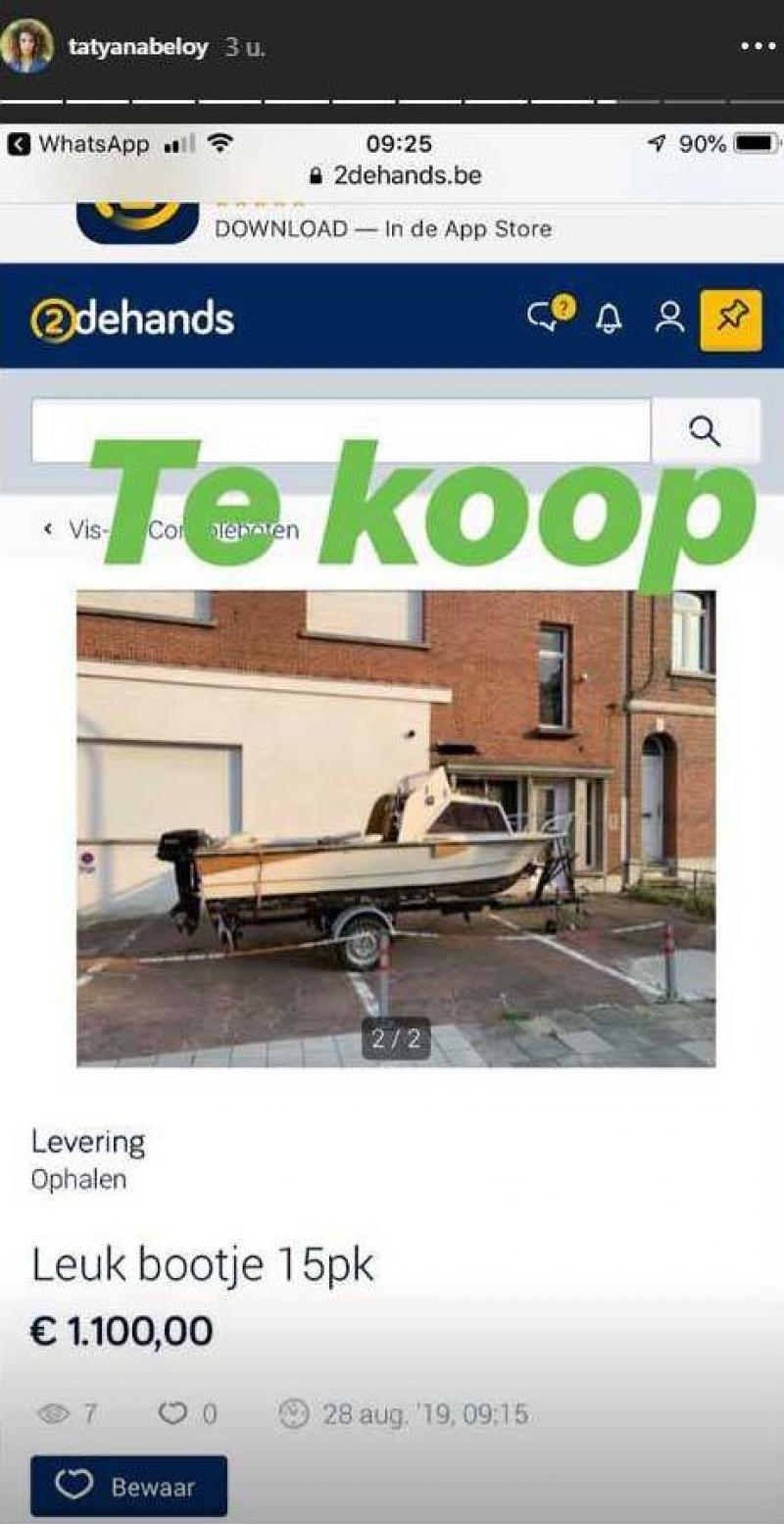 Heb je er altijd van gedroomd om een boot te hebben, maar viel je telkens achterover van de prijs? Wel, misschien is het bootje van Tatyana Beloy dan iets voor jou. De 34-jarige actrice uit Antwerpen kondigde op Instagram aan dat ze die van haar immers van de hand doet, voor de schappelijke prijs van 1.100 euro.