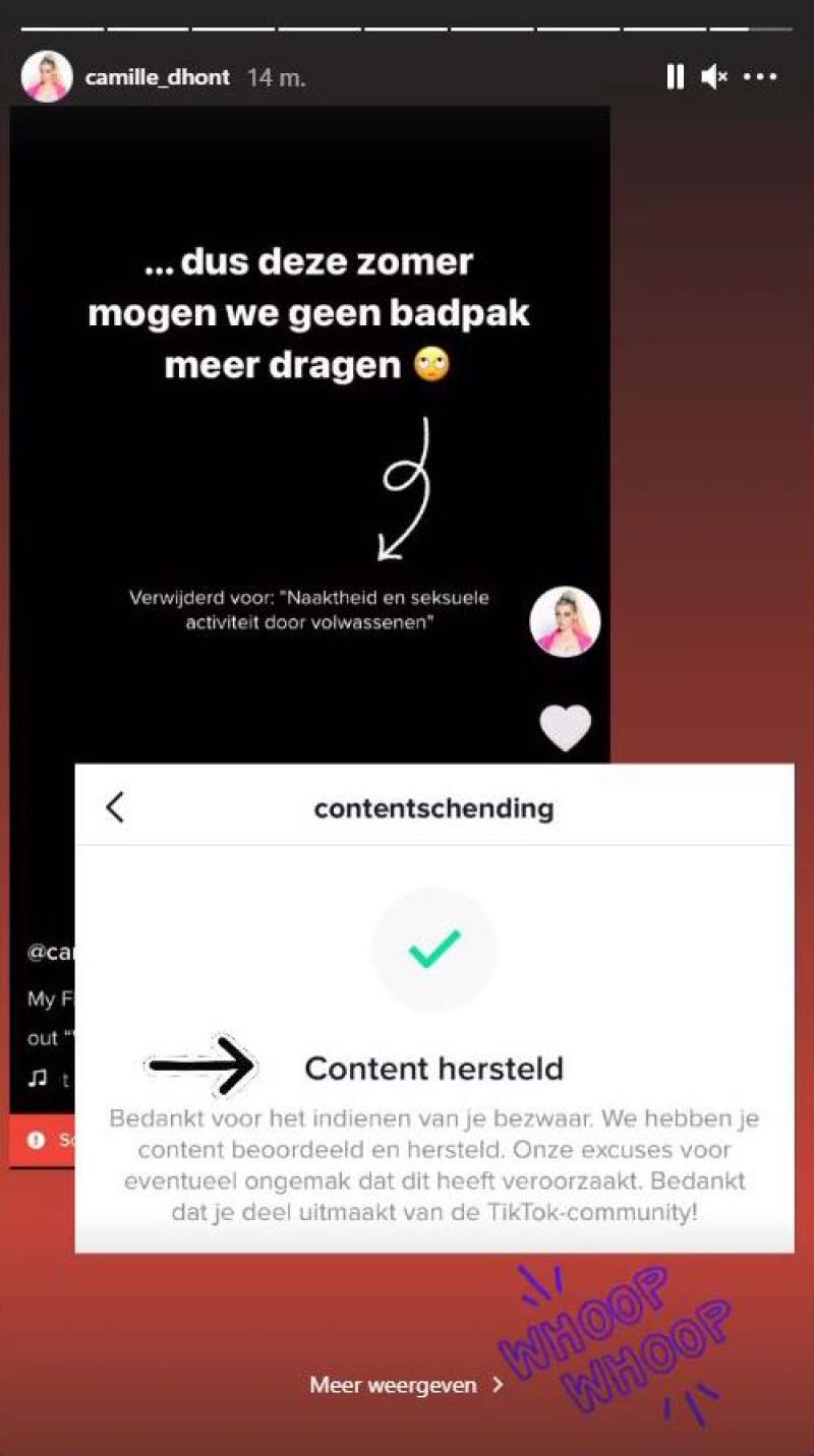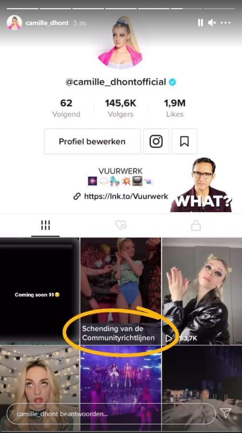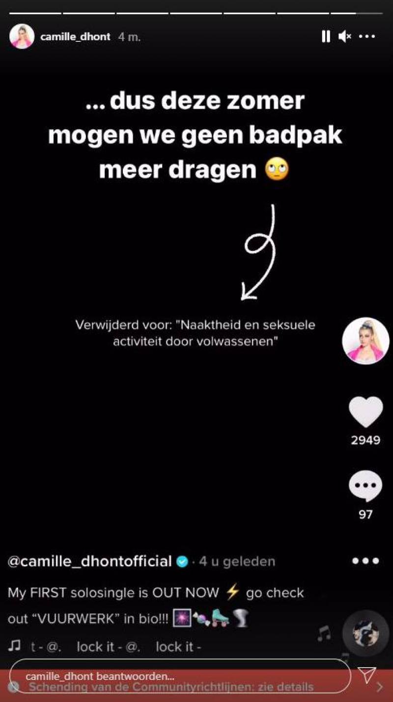 Het gaat om achter de schermen'-beelden van de videoclip van haar nieuw nummer Vuurwerk'. Daarin danst ze in badpak voor de camera terwijl haar make-up gedaan wordt. Via TikTok kreeg ze een melding dat de video de communityrichtlijnen schendt en hij daarom verwijderd werd voor naaktheid en seksuele activiteit door volwassenen.
