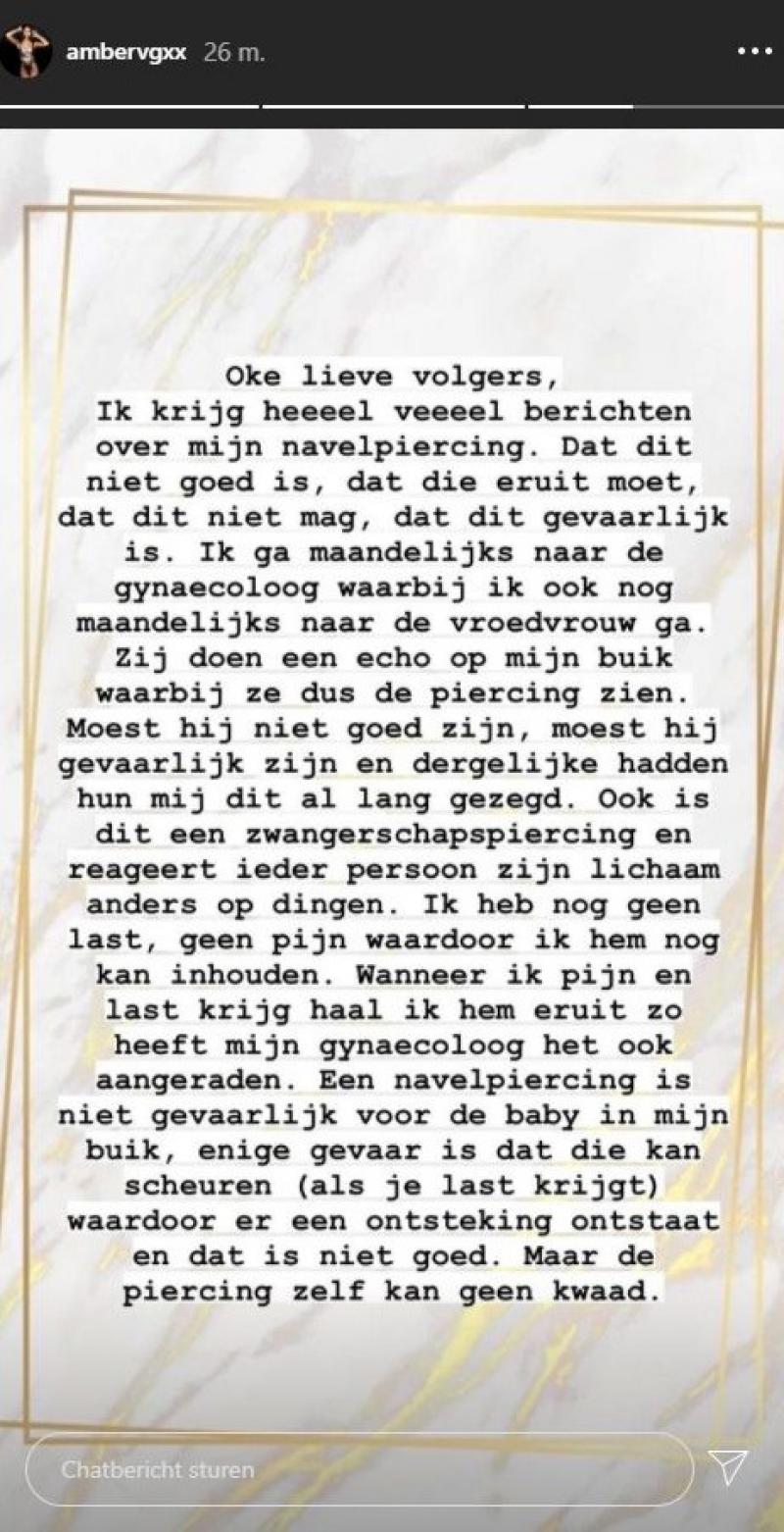 Amber maakte duidelijk dat haar gynaecoloog op de hoogte is van haar navelpiercing en dat ze wanneer ze er last van krijgt de piercing meteen zal uitdoen. Ik krijg heel veel berichten over mijn navelpiercing. Dat dit niet goed is, dat die eruit moet, dat dit niet mag, dat dit gevaarlijk is. Ik ga maandelijks naar de gynaecoloog en de vroedvrouw. Zij maken een echo op mijn buik en zien dus de piercing. Mocht dat gevaarlijk zijn, dan hadden ze mij dat al lang gezegd. Dit is trouwens een zwangerschapspiercing en ieder lichaam reageert anders op dingen. Ik heb nog geen last of pijn, dus kan ik hem nog inhouden. Mijn gynaecoloog heeft mij aangeraden om hem eruit te halen van zodra ik pijn krijg. Een navelpiercing is niet gevaarlijk voor de baby in mijn buik. Het enige gevaar is dat die kan scheuren (als je last krijgt) waardoor er een ontsteking ontstaat en dat is niet goed. Maar de piercing zelf kan geen kwaad, klinkt het.