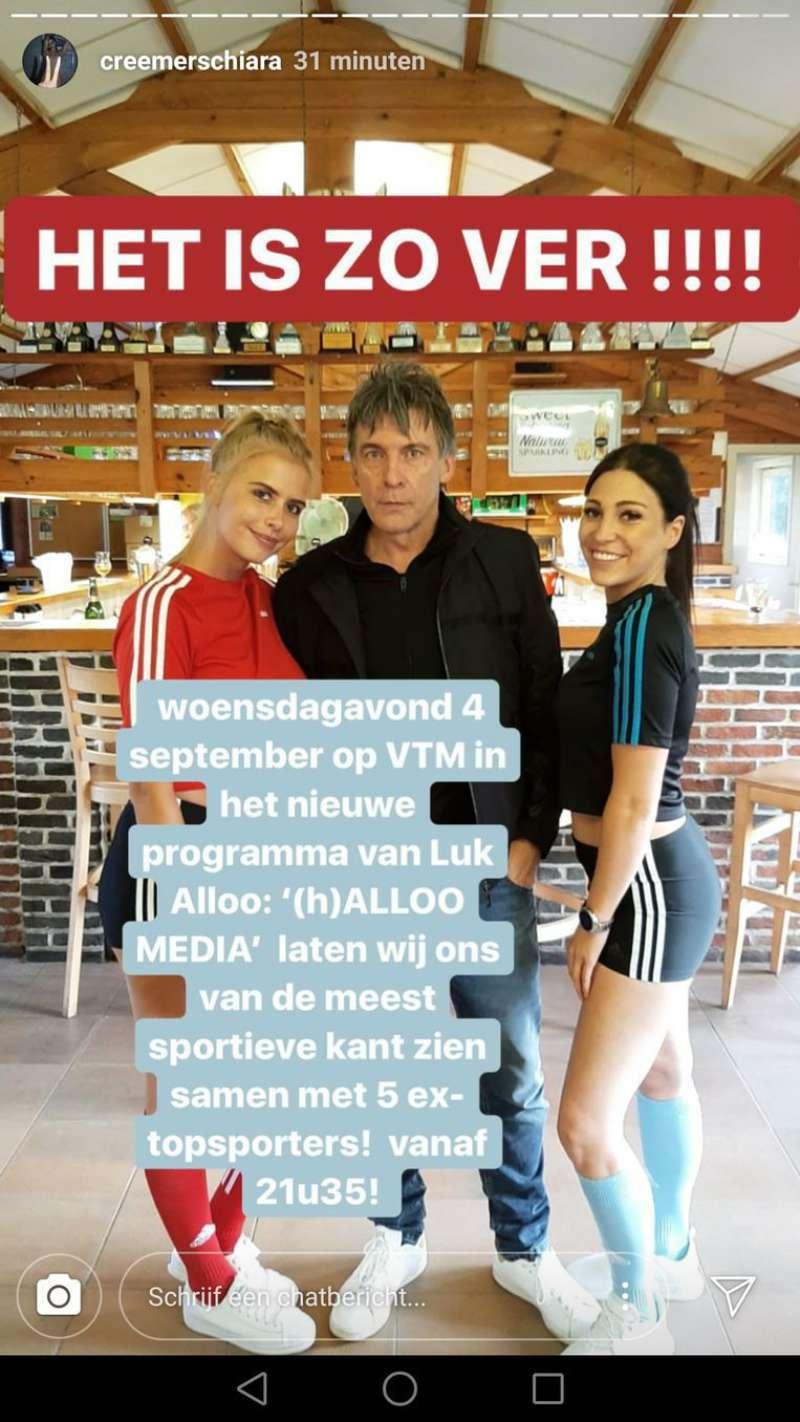 "Het is zover!" schrijft verleidster Chiara op haar Instagram Stories. "Op woensdagavond in het nieuwe programma van Luk Alloo laten wij ons van onze meest sportieve kant zien, samen met vijf ex-sporters! Vanaf 21u35"