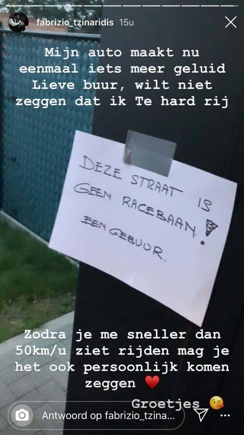 Fabrizio trof gisteren een geschreven boodschap van een gebuur aan op zijn voordeur. De man of vrouw maakte hem kort en krachtig duidelijk dat hij rustiger moet rijden. Deze straat is geen racebaan! Een gebuur, stond er op het briefje.