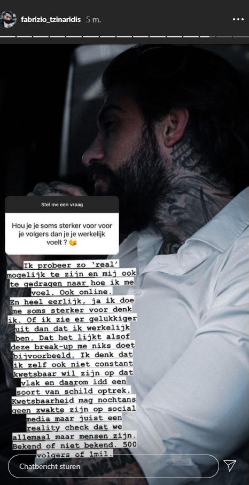 Op Instagram vroeg een volger of Fabrizio zich soms sterker voordoet dan hij is. Hij gaf daar een heel eerlijk antwoord op. Ik probeer zo real' mogelijk te zijn en mij te gedragen naar hoe ik me voel. Ook online. En heel eerlijk: ja, ik doe me soms sterker voor, denk ik. Of ik zie er gelukkiger uit dan ik werkelijk ben. Dat het lijkt alsof deze break-up me niets doet, bijvoorbeeld. Ik denk dat ik zelf ook niet constant kwetsbaar wil zijn op dat vlak en daarom inderdaad een soort van schild optrek. Kwetsbaarheid mag nochtans geen zwakte zijn op sociale media, maar juist een realitycheck dat we allemaal maar mensen zijn. Bekend of niet bekend, 500 volgers of één miljoen, schrijft hij.