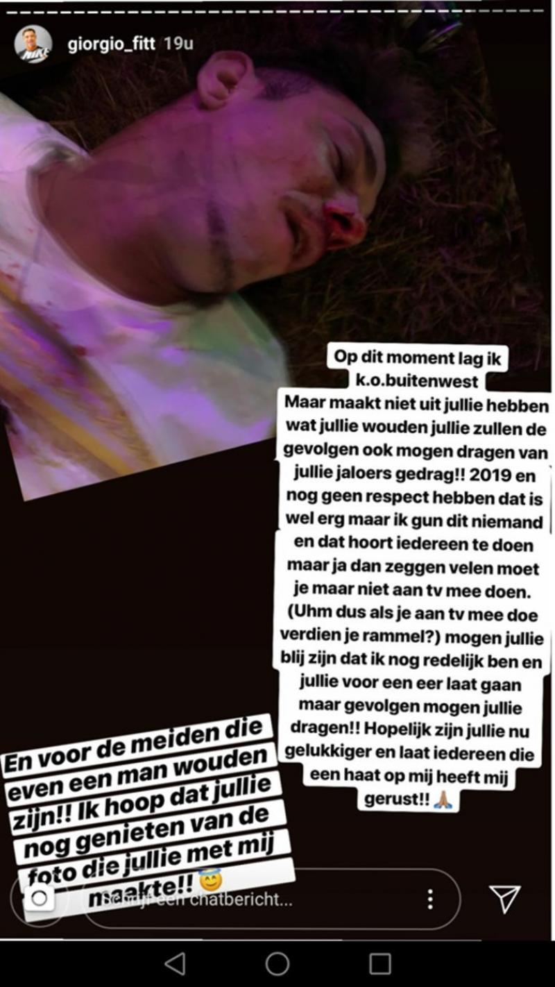 De vechtpartij liep snel uit de hand. Giorgio kon zich niet verweren tegen de grote bende. "Samra is op mij gaan liggen, maar die gasten bleven gewoon verder slaan. Ze hebben mijn neus en haar arm gebroken. En Samra heeft vier gebroken ribben."
