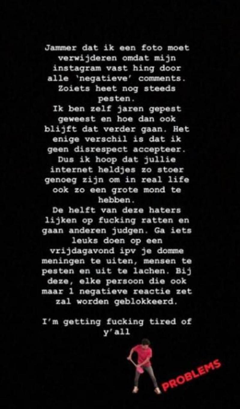 Ze benadrukte dat ze vroeger jarenlang gekampt heeft met pesterijen en dat ze niet van plan is om dat te blijven accepteren. Jammer dat ik een foto moet verwijderen omdat mijn Instagram vasthing door alle negatieve' comments. Zoiets heet nog steeds pesten. Ik ben zelf jarenlang gepest geweest en hoe dan ook blijft dat verdergaan. Het enige verschil is dat ik geen disrespect accepteer. Dus ik hoop dat jullie internetheldjes stoer genoeg zijn om in real life ook zo'n grote mond te hebben. De helft van deze haters lijkt op f*cking ratten en gaat anderen beoordelen. Ga iets leuks doen op een vrijdagavond in plaats van je domme meningen te uiten, mensen te pesten en uit te lachen. Bij deze: elke persoon die ook maar één negatieve reactie zet, zal worden geblokkeerd. Ik word f*cking moe van jullie, klinkt het.