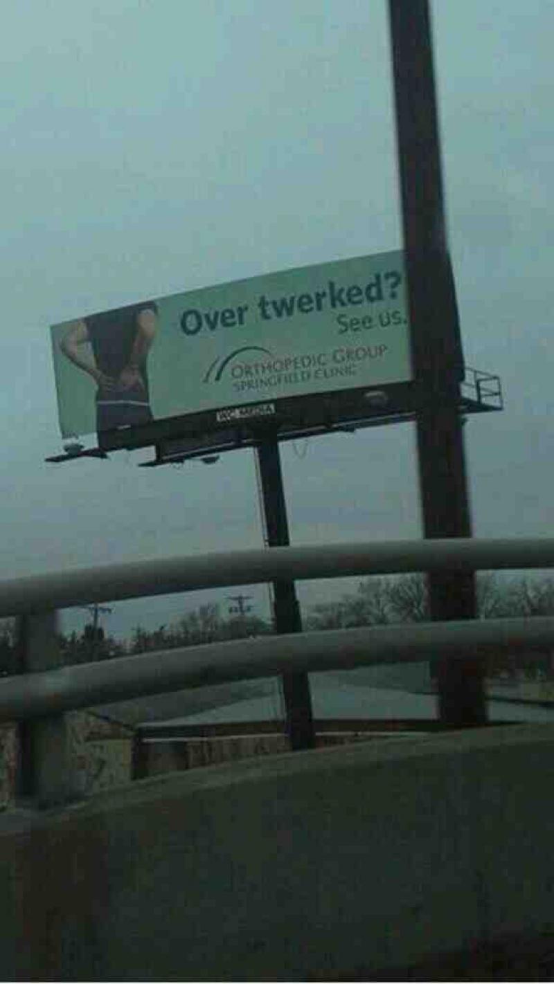 Dankzij Miley Cyrus is de hele wereld in de ban van het twerken. Maar door te vaak en te intens met je billen te schudden, kan je wel al eens een blessure oplopen. Dat bedacht ook een orthopedist uit Springfield zich, waardoor hij de slogan "Over twerked? See us." bedacht. Met deze slogan probeert hij slim in te spelen op de hype en meer klanten naar zijn praktijk te lokken. Of dat gelukt is, laten we in het midden, maar wij weten alvast waar we heen moeten als er de volgende keer iets misloopt op de dansvloer.