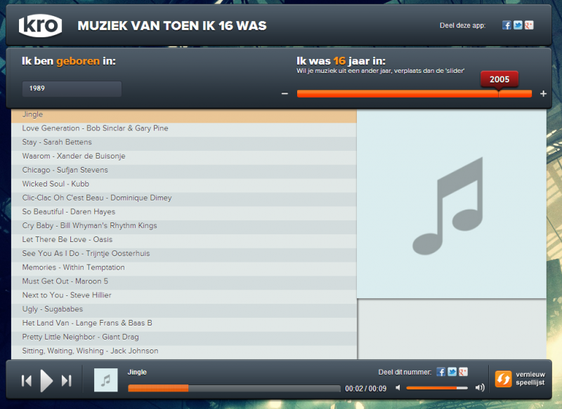Herinner jij je nog op welke liedjes jij de dansvloer onveilig maakte toen je voor de eerste keer mocht uitgaan? De Nederlandse omroep KRO helpt je alvast om je geheugen op te frissen. Dankzij hun website Muziek van toen ik 16 was' kan je de populairste nummers terugluisteren uit het jaar dat jij deze magische leeftijd bereikte. Of wil je liever weten welke plaatjes hip waren toen je trouwde of geboren werd? Gewoon het juiste jaar invullen op de website en je komt het dadelijk te weten.