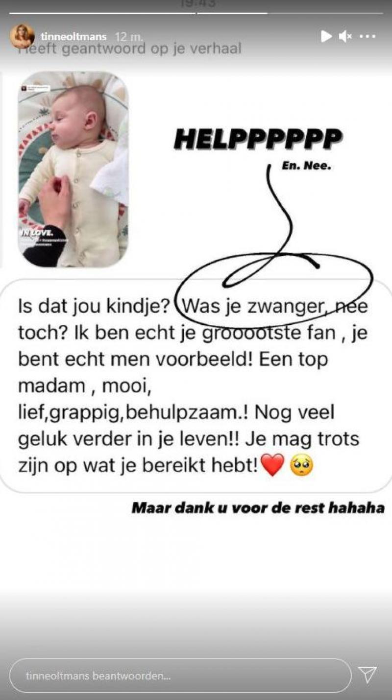 De 28-jarige actrice en zangeres Tinne Oltmans deelde enkele dagen geleden een foto van een baby op Instagram Stories. Verliefd!, schreef ze erbij. Wellicht ging het om een kindje van vrienden van haar, al had een grote fan van haar dat niet meteen begrepen. Is dat jouw kindje? Was je zwanger, nee toch?, vroeg ze haar via een bericht.