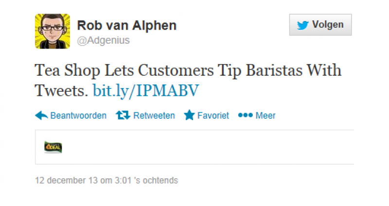 Argo Tea, een theecafé dat je over de hele wereld terugvindt, heeft besloten om Twitter in te zetten om hun vlijtige barista's te belonen. Vanaf 5 december tot 24 december zal de keten voor elke tweet naar een specifieke barista een extra dollar neertellen voor die persoon. Op het einde van het jaar worden alle tweets verzameld en krijgen ze deze bonus bovenop hun maandelijks loon. Zo proberen ze de loyaliteit van hun personeel extra in de verf te zetten.