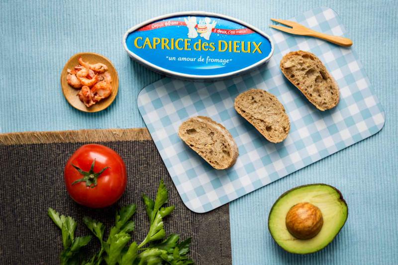 Beleg de stukjes brood met het mengsel van tomaat en avocado. Leg er een sneetje Caprice des Dieux op en een portie fijngehakte rivierkreeftjes. Werk af met een blaadje peterselie ter decoratie.