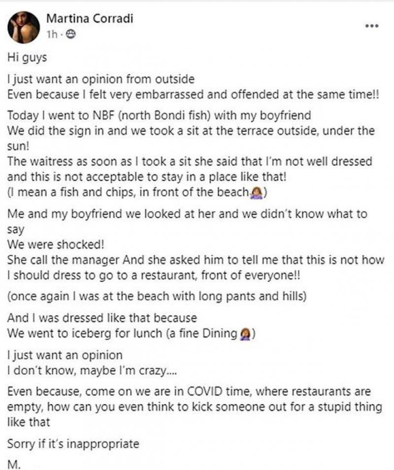 De gechoqueerde vrouw beschreef het incident achteraf op de Facebookpagina Bondi Local Loop' en vroeg of de reactie van het personeel niet overdreven was. Ik zou graag jullie mening hierover weten. Het was erg gênant en ik vond het beledigend. Ik weet het niet, misschien ben ik gek. Maar komaan, zeker nu in coronatijden, terwijl alle restaurants leeg zijn: hoe kan je dan iemand buitengooien voor zoiets stoms?, vroeg ze.