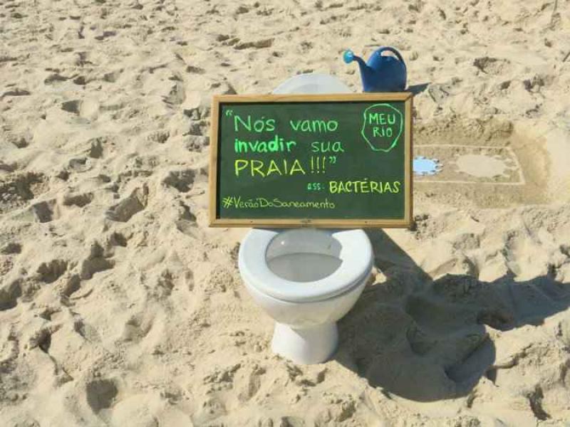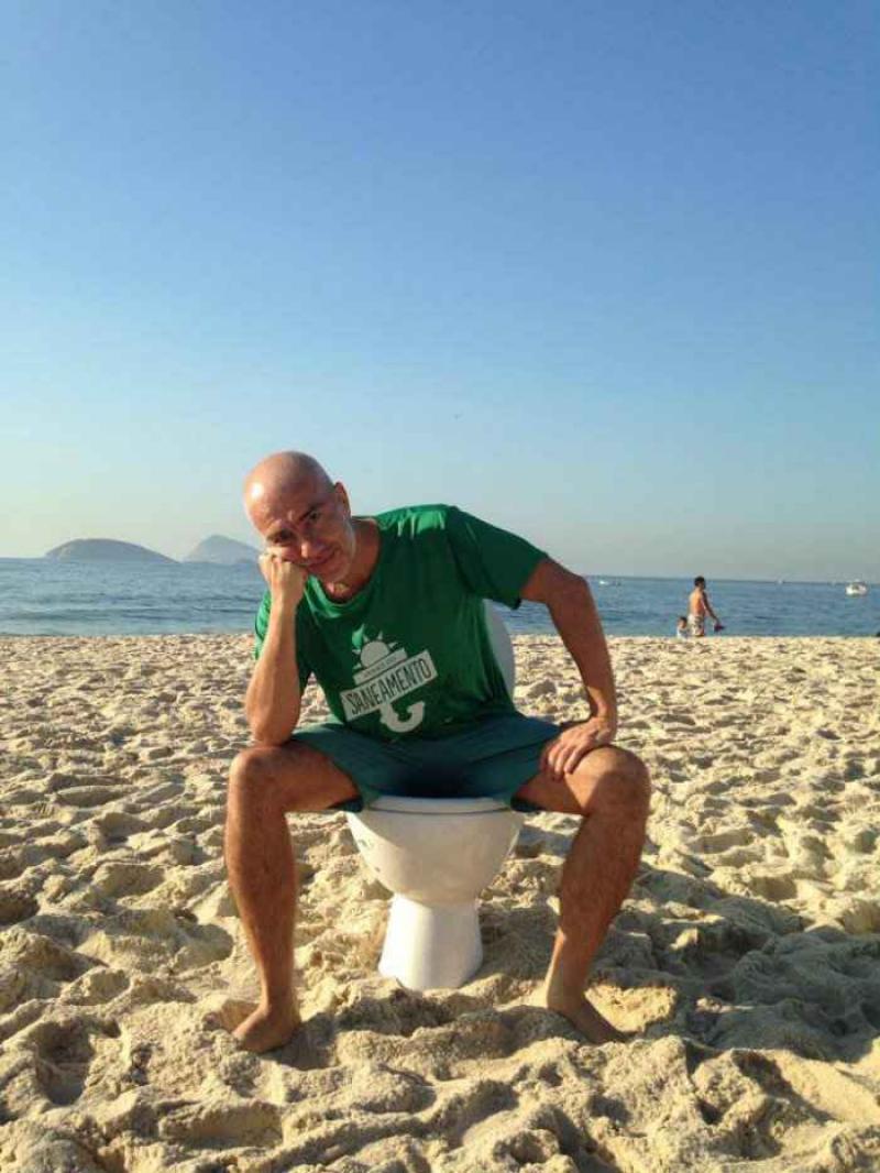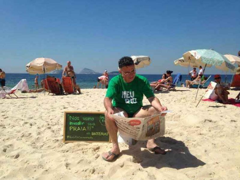 Dit weekend lieten demonstranten hun broek zakken op het strand van Ipanema in Rio de Janeiro. Daarna namen zij plaats op wc-potten, geplaatst door protestorganisatie Meu Rio (Mijn Rio). Meu Rio klaagt zo tegen de duizenden liters ongefilterd rioolwater die dagelijks in de zee geloosd worden.