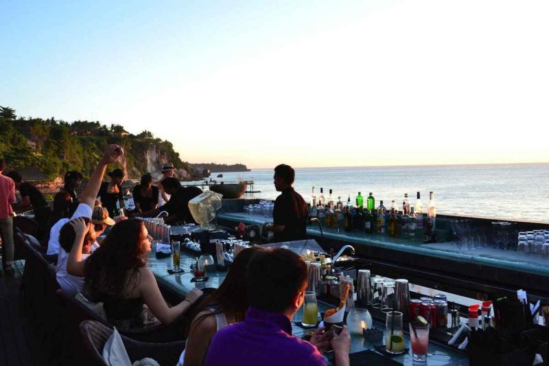 Vanuit de Rock Bar in het Ayana Resort en Spa in Bali kan je de vissersboten voorbij zien varen en een prachtige zonsondergang beleven tijdens je avondmaal.