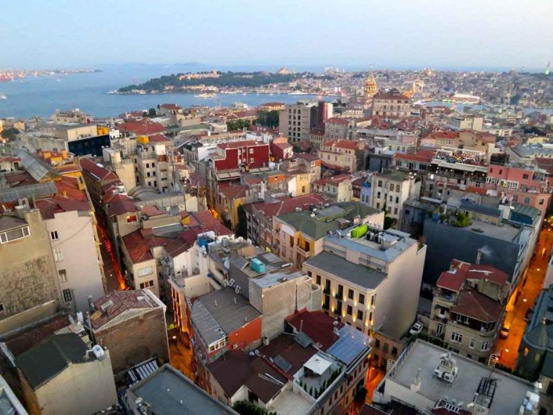 Terwijl je een ruime keuze hebt uit Turks-Scandinavische gerechten, kijk je vanuit dit dakrestaurant van het Marmara Pera Hotel uit over heel Istanbul.