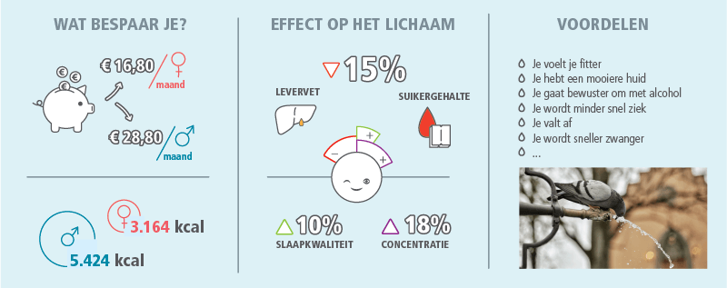 Opvallend genoeg zijn er maar weinig studies gedaan naar het effect van een maand zonder alcohol. Toch zijn heel wat deskundigen ervan overtuigd dat geheelonthouding een heleboel voordelen heeft. Een eerste bonus is een dikkere portefeuille op het einde van de maand. Volgens cijfers van de Vereniging voor Alcohol- en andere Drugsproblemen (VAD) drinken mannen gemiddeld twaalf glazen alcohol per week, vrouwen slaan er slechts' zeven achterover. In totaal sparen mannen per maand minstens 28,8 euro uit. Bij vrouwen is dat 16,8 euro.