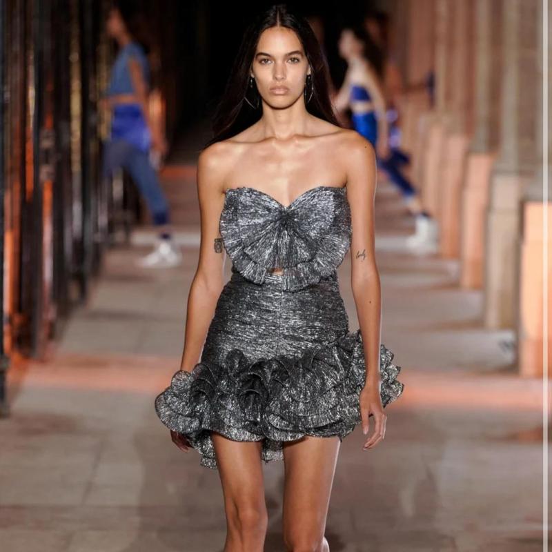 Dit seizoen spot je heel wat kledingstukken die voorzien zijn van touwtjes. Die kan je bijvoorbeeld vastknopen rond je buik om een ode te brengen aan geometrische mode. Jurken met een opvallende structuur en gepimpt met touwtjes zijn ook van de partij.