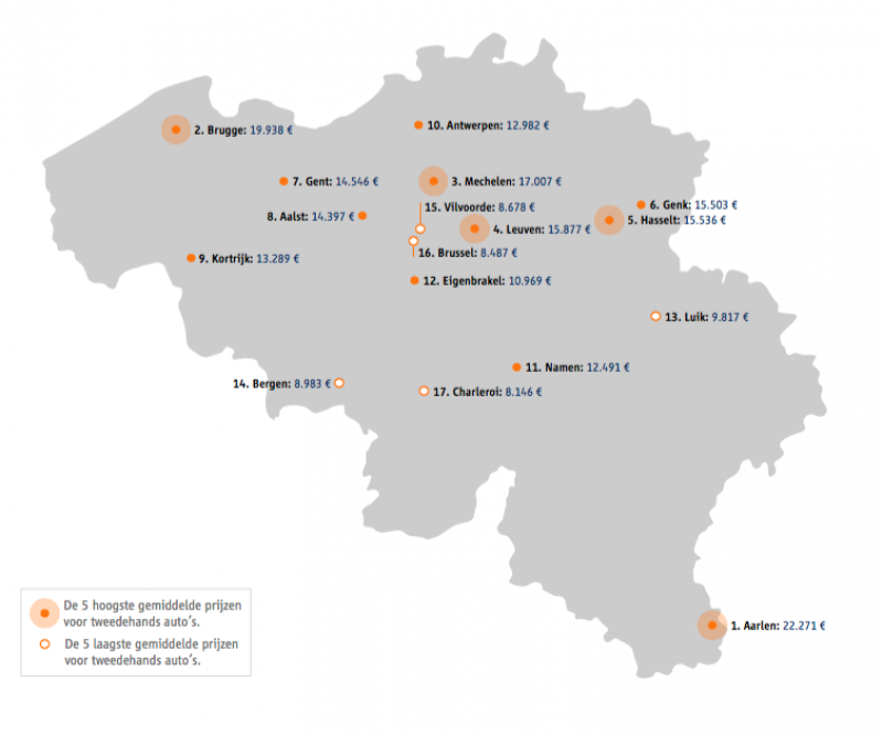Een tweede opmerkelijke vaststelling is dat de gemiddelde prijs van een tweedehandsauto gevoelig hoger is in Vlaanderen dan in Franstalig België. Met uitzondering van Aarlen, de duurste plek in België om een occasie te kopen, maar dat is te verklaren door het feit dat het Groothertogdom Luxemburg op een steenworp afstand ligt. De duurste stad in Vlaanderen om een occasie te kopen, is Brugge. Daar betaal je gemiddeld 19.938. Mechelen ( 17.007) en Leuven ( 15.877) vervolledigen de top drie. Een schril contrast met Brussel, de op een na goedkoopste stad in België. Je betaalt er gemiddeld 8.487 voor een tweedehandswagen. Alleen in Charleroi is het nóg goedkoper ( 8.146).