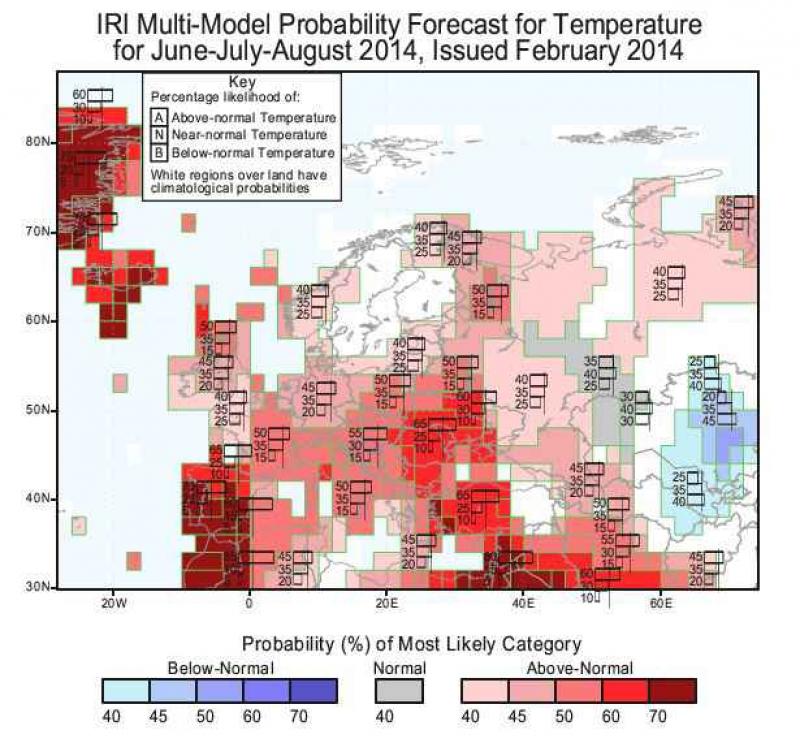 Hieronder zie je het kaartje dat het IRI heeft gemaakt. Hoe roder een gebied is, hoe groter de kans dat daar bovengemiddelde temperaturen zullen zijn tijdens de juni, juli en augustus.
