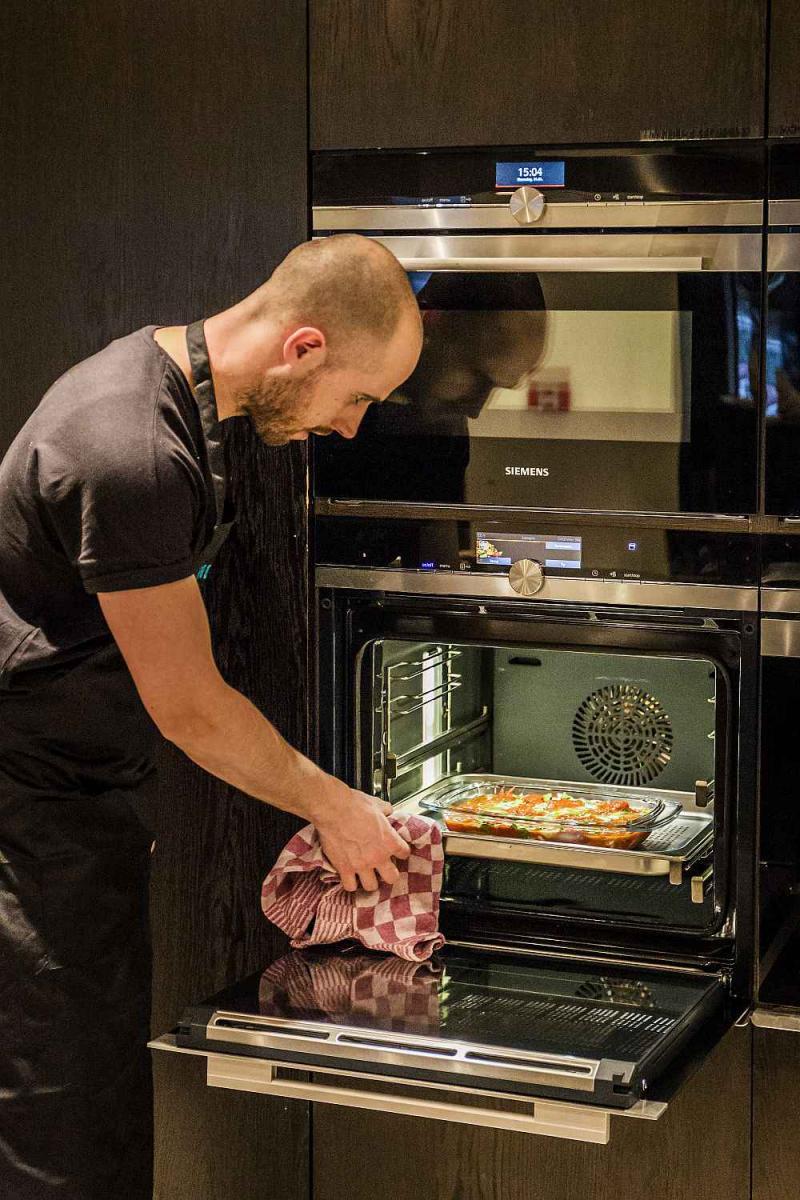 Dek de schotel af met zilverpapier en laat de lasagne minstens drie kwartier garen in de oven. Laat voor het opdienen een tiental minuten afkoelen.
