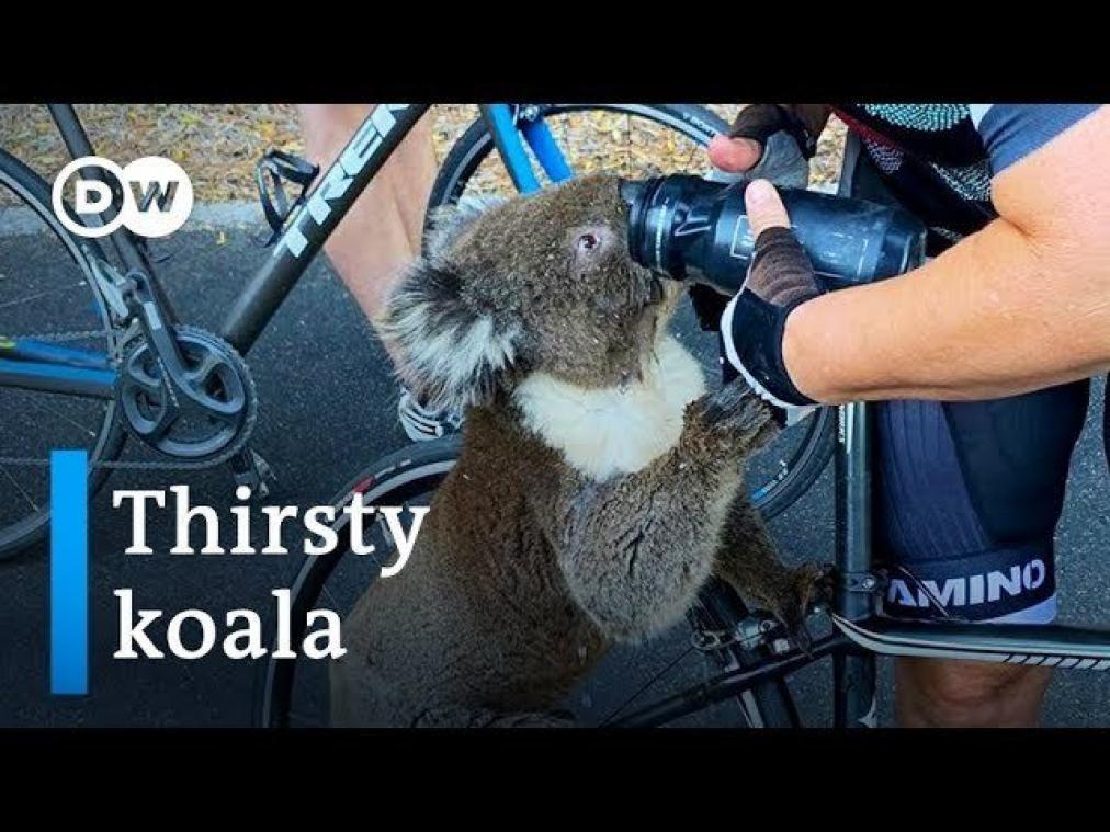 Op de beelden is te zien hoe het schattige dier zich vastklampt aan de koersfiets terwijl hij grote teugen water slikt. Hij was schijnbaar uitgedroogd: "Hij kwam naar mij gewandeld, met redelijk snelle tred voor een koala. Hij klom op mijn fiets en ik bood hem mijn waterfles aan. Niemand van ons had ooit zoiets gezien", aldus de fietsster. Daarna heeft het groepje fietsers de koala terug naar de bossen geleid aan de kant van de weg.