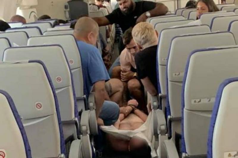 Op een video-opname is te zien hoe twee mannen, zo'n twee uur na aanvang van de vlucht, met elkaar op de vuist gaan. Een van beiden wordt tijdens het handgemeen door de ander in een wurggreep genomen.