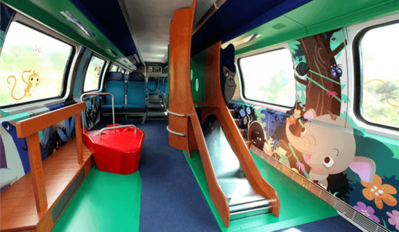 Glijbanen en bordspelletjes entertainen de kinderen in een kleurrijke wagon. En de buggy's en andere bagage, die krijgen een plekje op het gelijkvloers. Als iemand zich nog afvraagt waarom het openbaar vervoer in Zwitserland zo populair is: 'Tevreden kinderen, tevreden ouders!'.