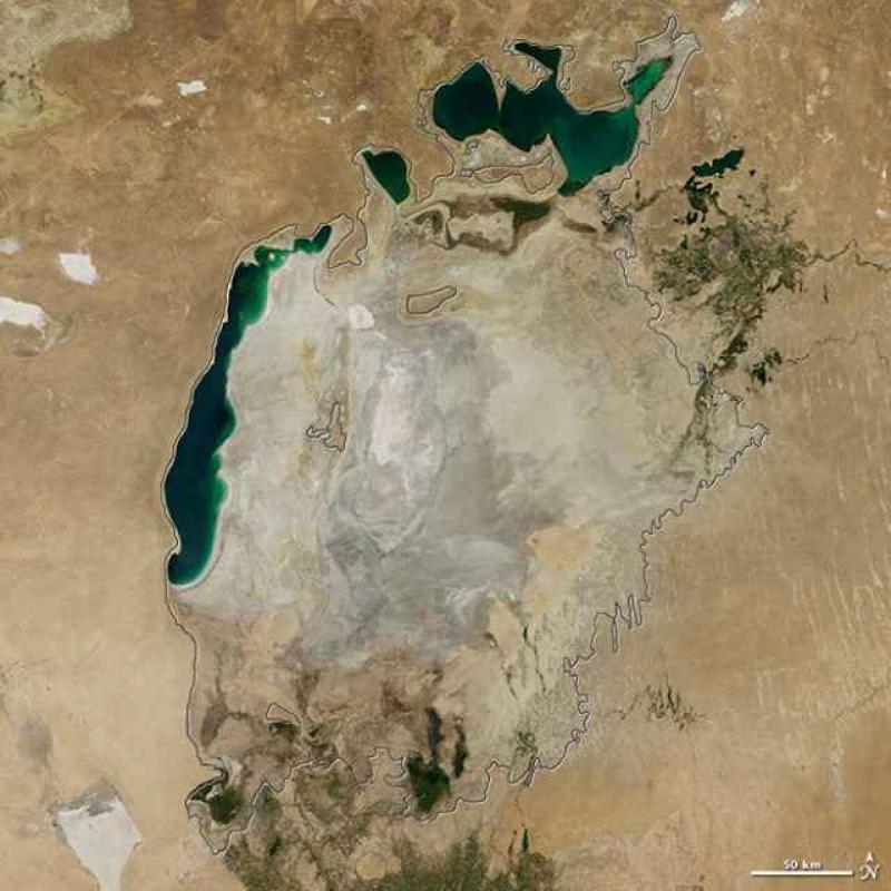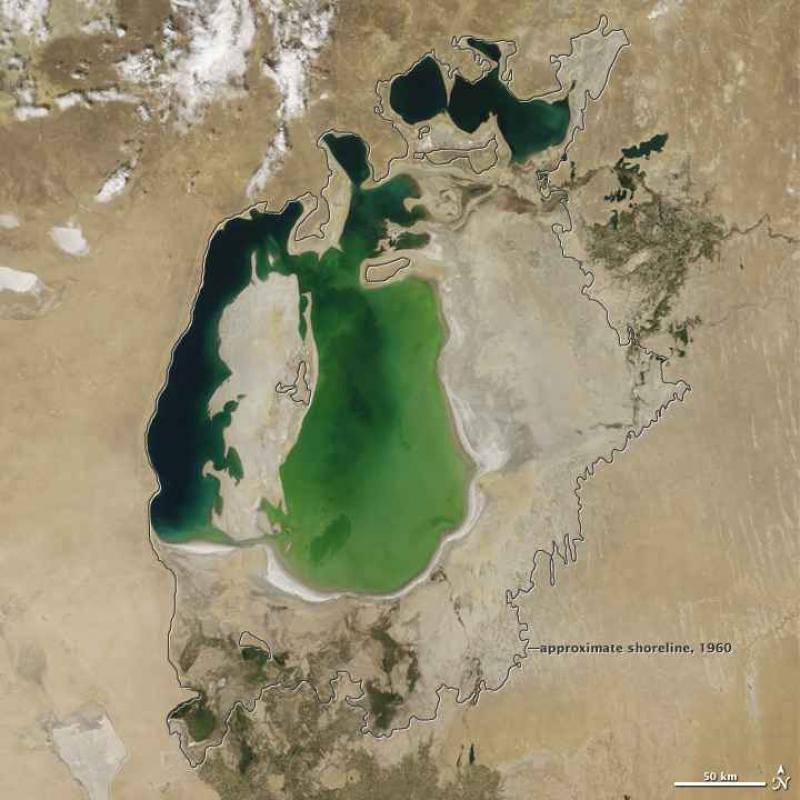 Het Aralmeer, ooit het op drie na grootste zoetwatermeer ter wereld, is bijna volledig verdwenen. NASA heeft dramatische foto's vrijgegeven van de snelle desintegratie in de afgelopen 14 jaar. De prachtige, trotse, blauwe plas is nu niets meer dan een woestenij met gebarsten bodem, verroeste schepen en gestrande boten.
