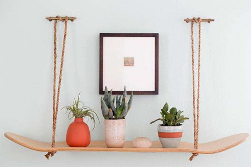 Elke millennial heeft wel een skaterfase meegemaakt. Wie was er immers niet in de ban van Avril Lavigne en 'Sk8er Boy'? Als je toevallig nog een oud skateboard hebt liggen, dan is dit het ideale projectje voor jou. Schroef de wieltjes eraf, boor wat gaten en hang het skateboard aan de muur met behulp van touw. Ziet er helemaal hipster uit en zo komt dat ding toch nog van pas.