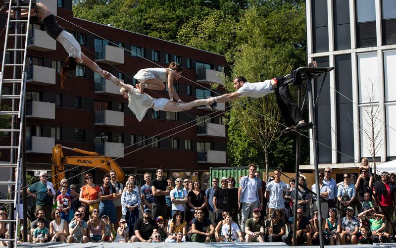 Dit weekend is de Leuvense Vaartkom het decor voor de gekste circustoeren: traditioneel in kleurrijke tenten of verrassend in het straatbeeld. Het Sluispark is het kloppende hart van het festival, maar ook de omliggende pleinen en gebouwen verwelkomen bijzondere artiesten uit binnen- en buitenland. Wat je mag verwachten? Drie artiesten die vastzitten in een gesloten doos, een bende parkouracrobaten die klautert langs gevels en daken, een waaghals die gehuld in bubbelplastiek van een stelling duikt en een zoon die zijn vader draagt.