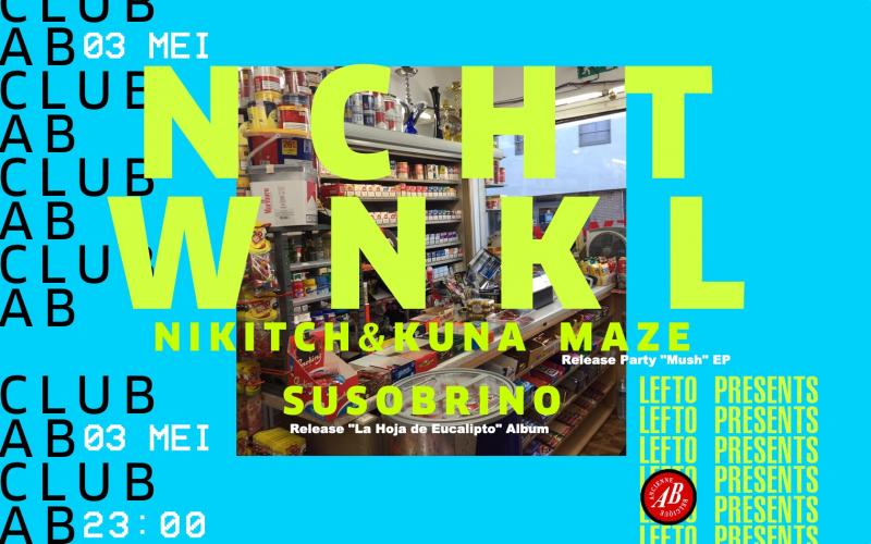 Met NCHTWNKL roept AB een gloednieuw feestconcept in het leven: clubavonden met de scherpste liveacts van het moment én de meest opmerkelijke dj's in de Brusselse scene. Tijdens deze eerste editie is het podium aan de Belgisch-Boliviaanse Susobrino, met zijn combinatie van electro en Zuid-Amerikaanse percussiemuziek, en het Franse duo Nikitch & Kuna Maze, twee klassieke muzikanten die al snel hun weg vonden naar jazz en elektronische muziek. Dj LeFtO maakt het feest compleet.