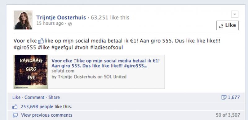 Bedrijven of bekende personen vergeten al wel eens de kracht van sociale media kunnen hebben. Dat kon de Nederlandse zangeres Trijntje ondervinden toen ze een euro steun beloofde voor elke like.