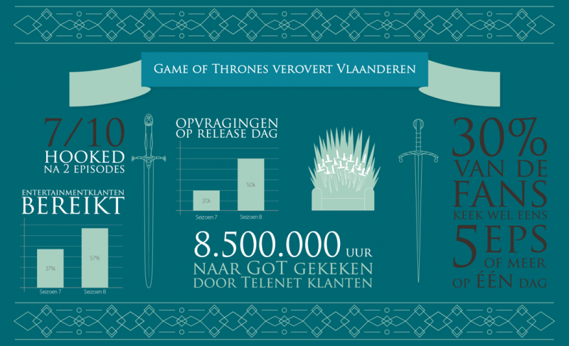 Net zoals in de rest van de wereld, was Game of Thrones ook in Vlaanderen een kijkcijferkanon. Telenet dook in de statistieken en kwam met enkele opmerkelijke cijfers voor de dag. Het bedrijf biedt de HBO-reeks aan via zijn Play- en Play More-abonnementen, een service waar de klanten gretig gebruik van maakten de afgelopen weken. Zo keken meer dan 57% van hen in de eerste maand van het achtste seizoen naar de serie. In 2017 was dat nog maar 37% voor het zevende seizoen. Globaal gesproken lagen de kijkcijfers het hoogste in Vlaams-Brabant en Antwerpen, en het laagst in West-Vlaanderen.